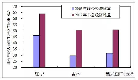 這里對民營經濟發(fā)展和國企改革多說一兩句。2003年,東北國企所占的比重很高,有的省占到70%,到2012年遼、吉、黑三省非公經濟比重分別達到64%、50.8%和51%。