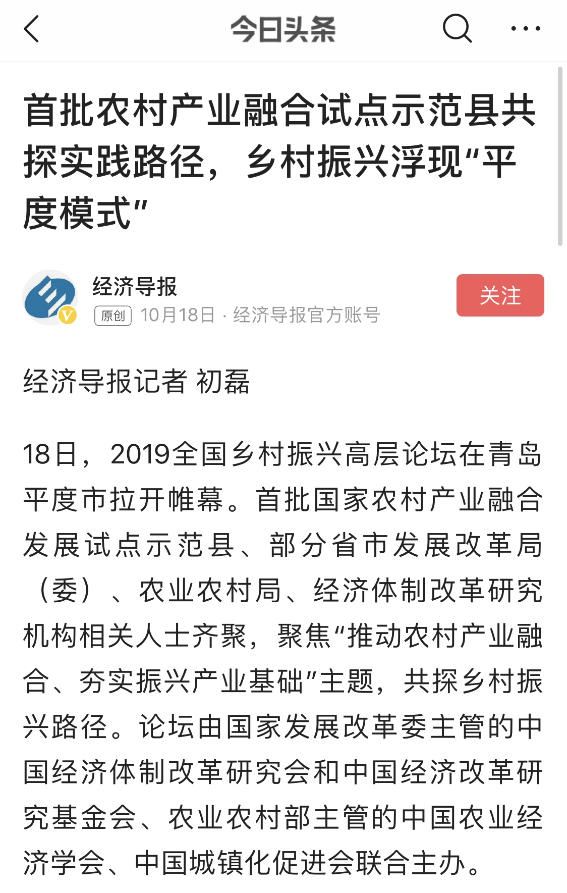 10月18日,中國(guó)經(jīng)濟(jì)體制改革研究會(huì)、中國(guó)農(nóng)業(yè)經(jīng)濟(jì)學(xué)會(huì)、中國(guó)經(jīng)濟(jì)改革研究基金會(huì)、中國(guó)城鎮(zhèn)化促進(jìn)會(huì)聯(lián)合主辦的2019全國(guó)鄉(xiāng)村振興高層論壇在平度市開幕,開啟了以“推動(dòng)農(nóng)村產(chǎn)業(yè)融合 夯實(shí)振興產(chǎn)業(yè)基礎(chǔ)”為主題的大討論。論壇上,中國(guó)經(jīng)濟(jì)體制改革研究會(huì)宣布把平度市列為博士后科研工作站調(diào)研基地,并授予平度“中國(guó)經(jīng)濟(jì)體制改革研究會(huì)博士后科研工作站調(diào)研基地”標(biāo)牌。